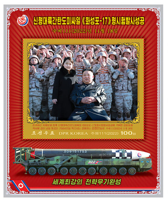 <사진설명 1> 2022년 11월 ICBM '화성-17형' 시험발사 현장에서 김주애가 처음 모습을 드러낸 것은 상징성이 크다. 체제의 안정성, 세습의 당위성, 군사력 과시가 한 장의 사진에 응축되어 있다. 북한은 그 모습을 우표로 제작하기도 했다. 조선우표사 홈페이지 캡처